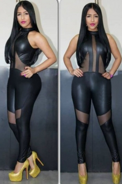 Show off your curves in this tightfitting, body hugging, faux leather jumpsuit with unique exquisite mesh cutouts detailed, slightly high crew collar, sleeveless top with long pants. If you're into the body-contour style, this is the right curve-hugging jumpsuit just for you!